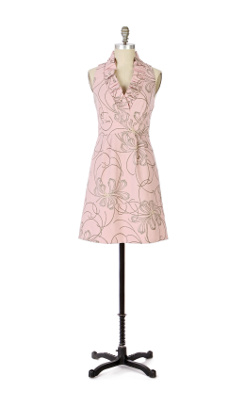 - A brook of fluid stitches traces paths along Leifsdottir's pale pink jacquard sheath. Ruffles make waves along the v-neck. Side zip